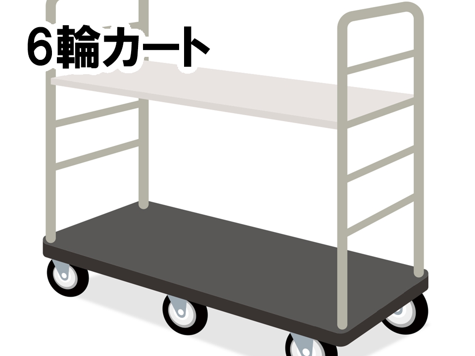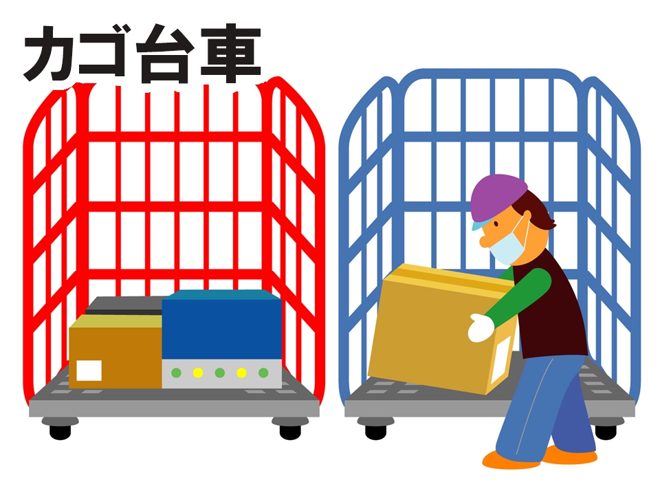 上記品物が6輪カートやカゴ台車または専用台車に乗せてバース付近前に並んで置いてあるので店舗名を確認して積み込みます。
